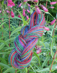 We also blend natural coloured alpaca with hand-dyed silk for luxurious blends in fabulous bright colours. This year our range is luscious and almost edible – raspberry, bananaberry, apricot swirl, blackberry, black spice, and lavender.