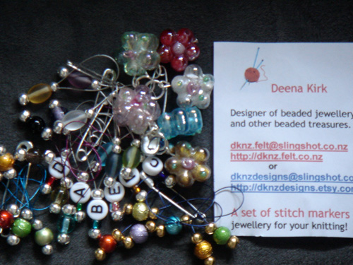 Deena Kirk is a designer of beaded jewellery and other beaded treasures, and she has sent in a sparkly selection of stitch markers! This picture shows a few of the designs - there are lots, and you are going to love having a bit of glam in your knitting.